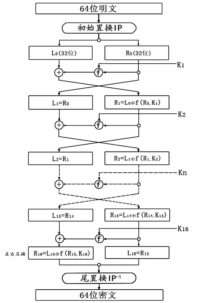 其中,第二部分和第三部分是 DES 算法的核心。 注意:DES 解密算法与加密算法完全相同,只需要将子密钥的使用顺序反过来就行了。