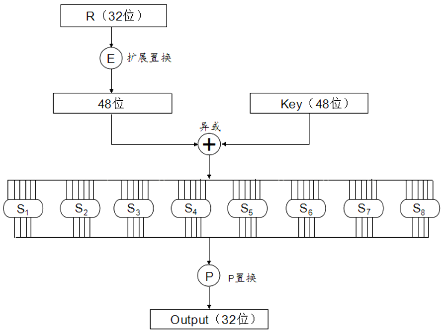 下面是密码函数 f(R, K)的流程图:
